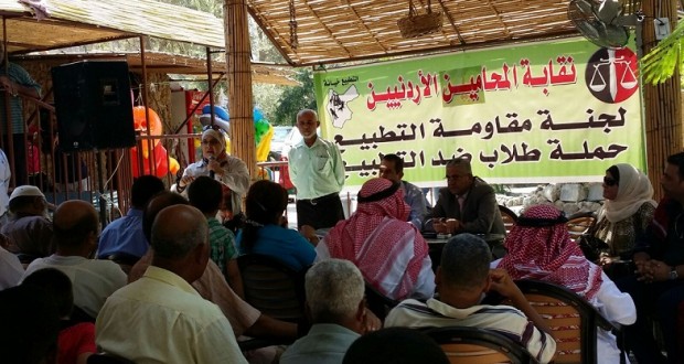 قالت لجنة مقاومة التطبيع في نقابة المحامين اللجنة ان احدى الجمعيات المطبعة مع الكيان الصهيوني تقوم بالدخول الى مدارس الاغوار الشمالية بموافقات وكتب رسمية من وزارة التربية والتعليم، وتقوم بإعطاء دورات للطلبة عن الأمن المائي والبيئة والسلام ، ومن ثم تقوم الجمعية بالتواصل مع الطلبة خارج المدارس وإرسالهم إلى الكيان الصهيوني رحلات يتخللها أنشطة لاتتوافق مع عاداتنا وتقاليدنا والقيم الاسلامية المحافظة. ولفتت اللجنة الى ان تلك الجمعية تقوم بعدة نشاطات في المناطق، مثل توزيع مساعدات مادية يحتاجها الأهالي، كما يقوم (صهاينة) بزيارة المنطقة والمكوث فيها عدة أيام بلباس فاضح وممارسات لا أخلاقية ، تتنافى مع الاعراف والعادات والتقاليد لأهل المنطقة . واقامت اللجنة مهرجان ( طلاب ضد التطبيع) في منطقتي المخيبه التحته والحمة الأردنية بهدف الى توعية أهل المناطق بخطورة التعامل مع العدو الصهيوني والجمعية المطبعه، والتي تستغل حالة الفقر والجهل وعدم البنية التحتية بحدها الأدنى، بما يؤثر إيجابا على الأهالي وتعاملهم مع هذه الجمعية المطبعة. وشارك في المهرجان النائب السابق ناريمان الروسان ورئيس لجنة مقاومة التطبيع في النقابة المحامي فتحي درادكه وعضو مجلس النقابة ورئيس لجنة الحريات في النقابة المحامي وليد العدوان المهرجان وعدد من محامين ومحاميات وطلاب الجامعات والمتطوعين وشركة سجل للتدريب والتنمية. واشتمل المهرجان على توزيع حقائب مدرسية وقرطاسيه لنحو 250 طالبا وطالبة من مختلف الأعمار، وفقرات ترفيهية للطلبة وتوزيع للهدايا والجوائز. واشارت اللجنة أنه سبق وان عقدت عدة نشاطات في ذات المناطق على وجه الخصوص لكونها من المناطق المخترقه تطبيعيا من قبل الصهاينة.