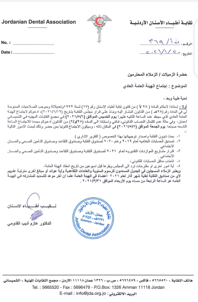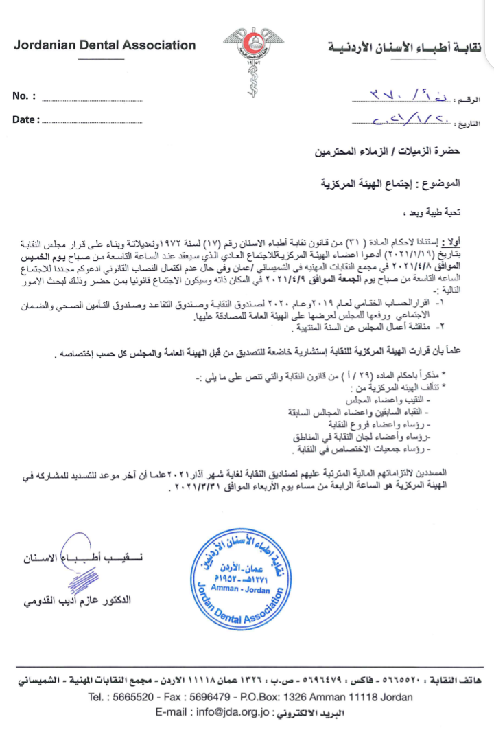 دعوة لاجتماع الهيئة العامة والهيئة المركزية لنقابة اطباء الاسنان نشرت بواسطة: محمد محيسن في اطباء اسنان 23 يناير,2021 التعليقات على دعوة لاجتماع الهيئة العامة والهيئة المركزية لنقابة اطباء الاسنان مغلقة 1,531 زيارة 2021-01-23 محمد محيسن tweet